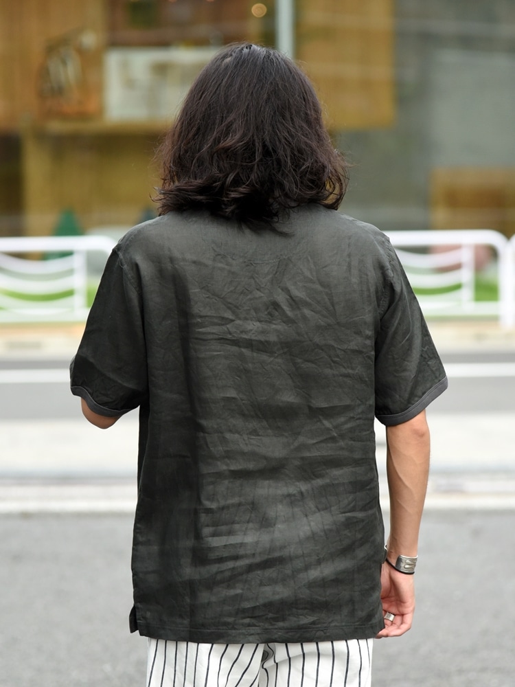 リネンのプルオーバーシャツにストライプのパンツを合わせた爽やか夏コーデ