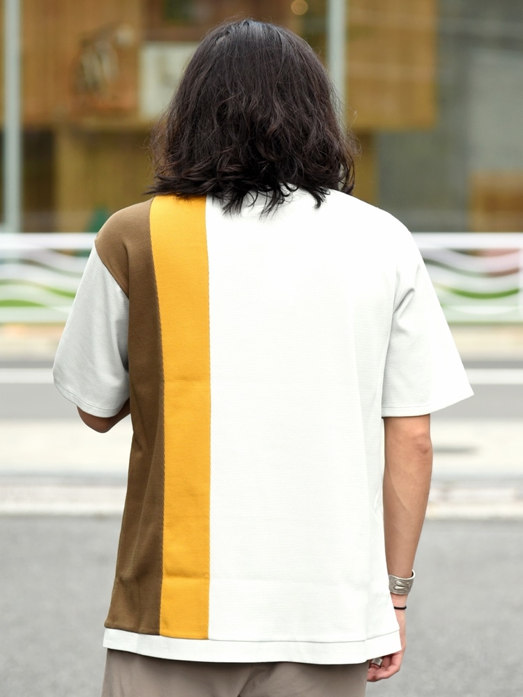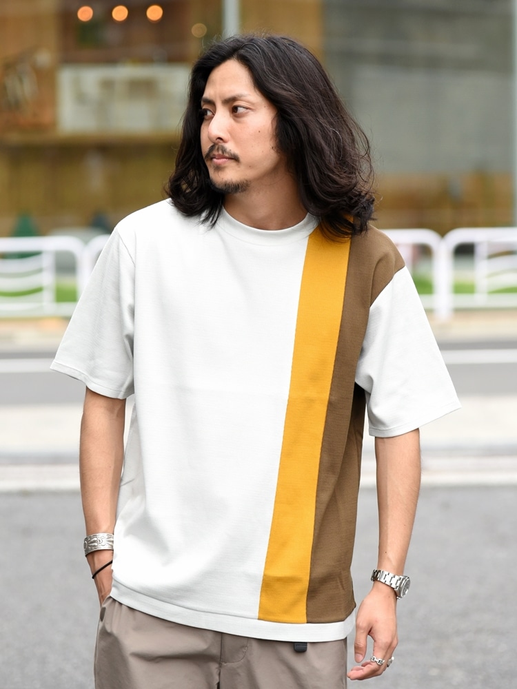 アシンメトリーな切り替えが特徴のカットソーとSHELTECHの高機能ショーツを合わせたアウトドアミックスコーデ
