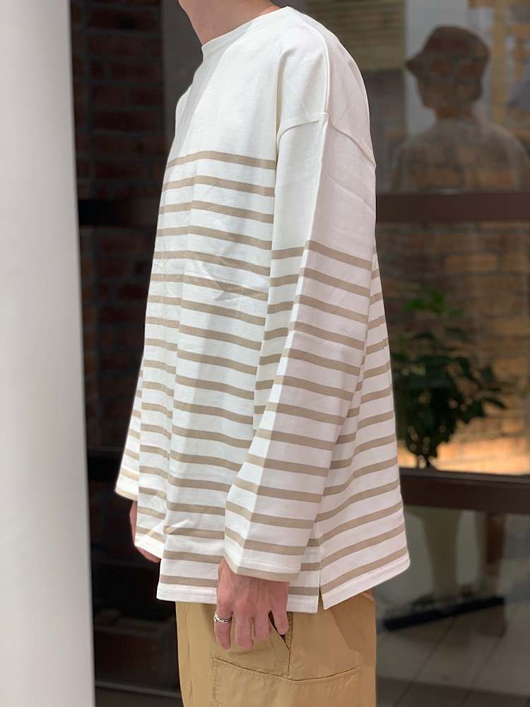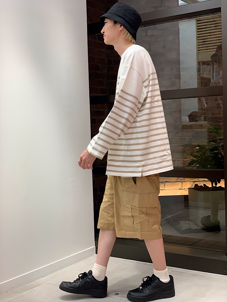 ショーツにロンTのスタイリングをベージュの同系色で合わせ帽子、足元を黒で統一感を出したコーディネートです。