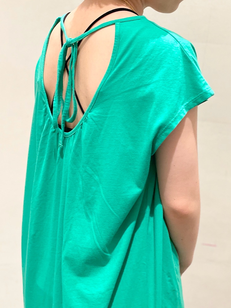 商品紹介:すごく滑らかな肌ざわりで汗でベタベタするこの季節には快適に着ていただけるワンピースです。首元のギャザーも女性らしくて可愛いポイントですが、背中が空いたバックシルエットもすごく可愛いです。