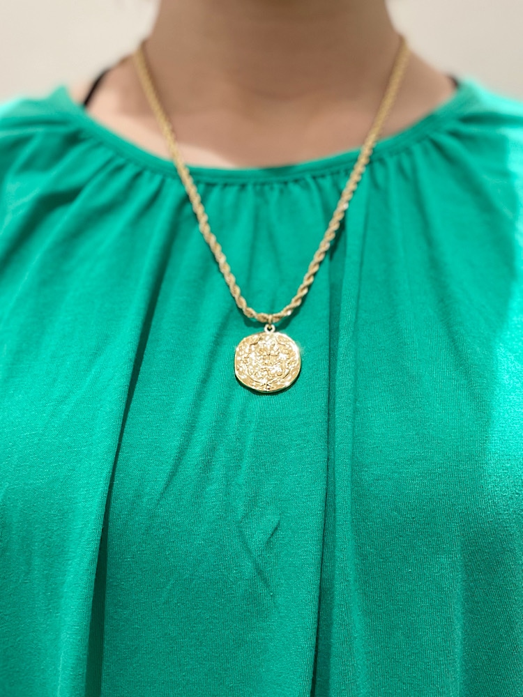 商品紹介:ゴールドが女性らしいネックレスです。シンプルなトップスに合わせて付けていただくとワンポイントになって可愛いです。