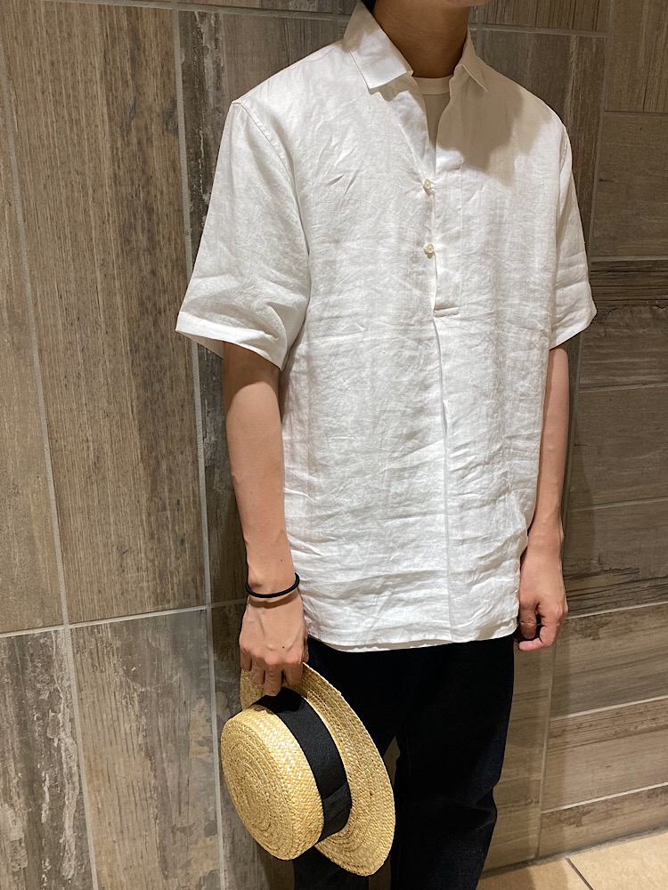 【素材感・着心地】麻素材で、パリッとした質感ではなく、柔らかさのある質感です。身幅やアームにややゆとりがあるので、夏場のリラクシングスタイルにオススメです!今回は無地を着用しましたが、ストライプ柄の展開もあるのでシンプルにもなり過ぎないと思います。