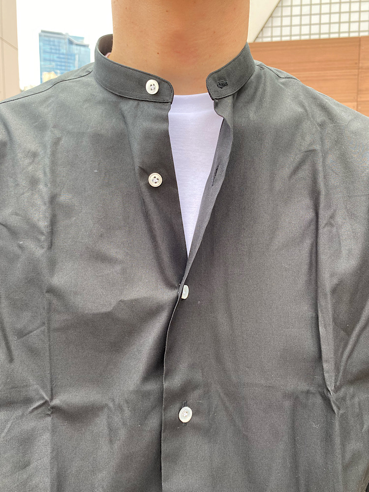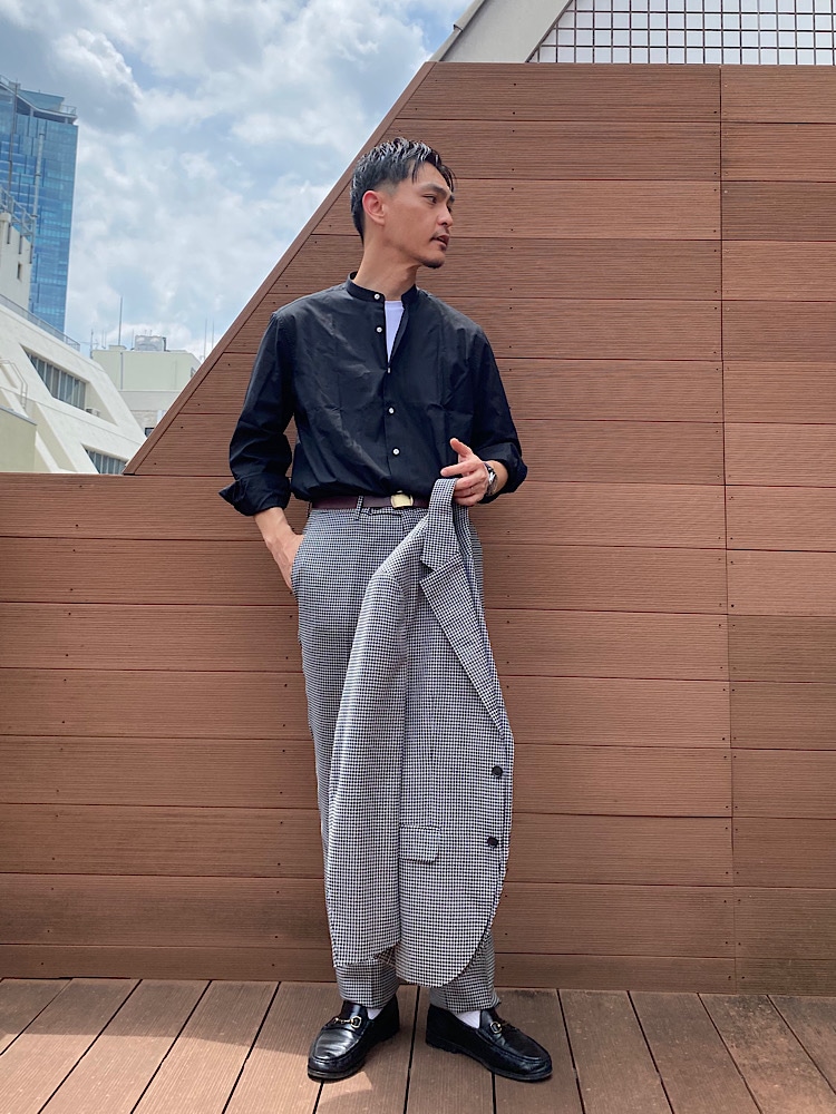 ほどよく抜け感のある、飾りすぎないスーツスタイルです。今の情勢下やネクタイをしない夏のスタイリングにもオススメです。