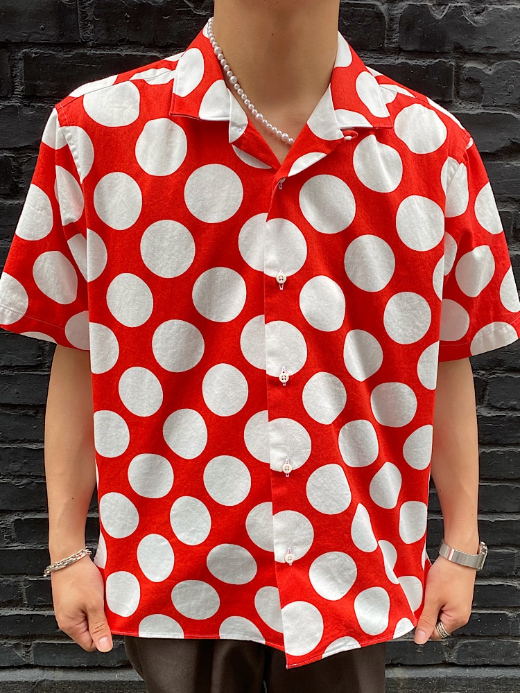 素材感・着心地:インパクトのあるドットと配色で存在感バッチリです。ボックスシルエットでややゆとりのあるサイズ感ですがワンサイズアップがオススメです。