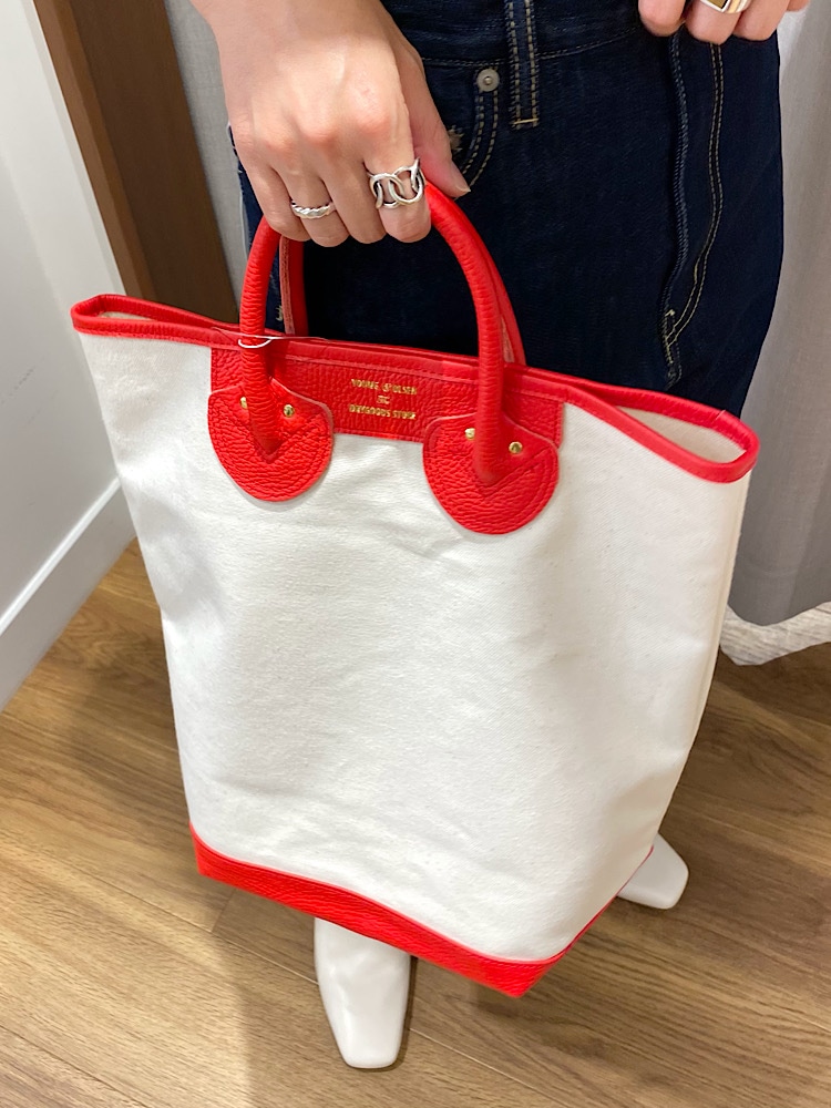 赤のバッグを差し色で取り入れ、マニッシュさを出しました。