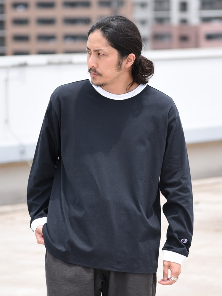 ChampionのリンガーTとGRAMICCIのワイドパンツを合わせたモノトーンコーデ