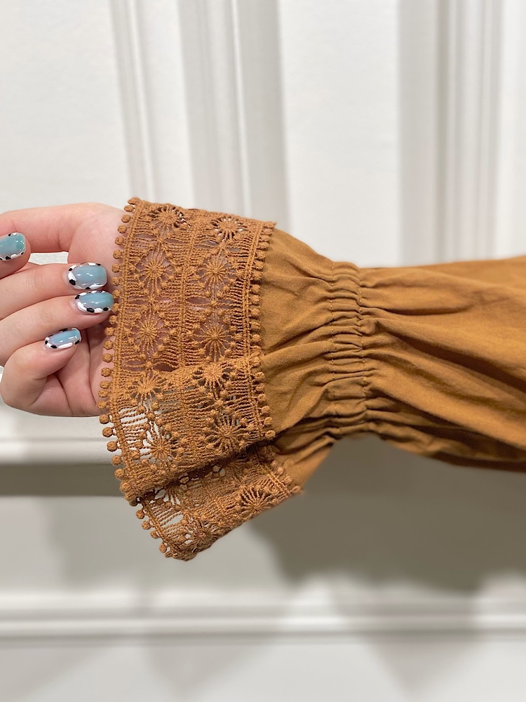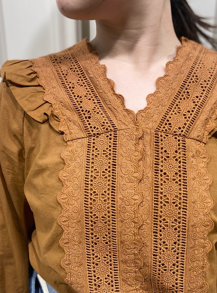 着心地:フロントに大きめなレースが大胆に入っているので、甘くなりすぎなくてオススメです。袖がまたレースを変えているので、楽しめる1枚です。