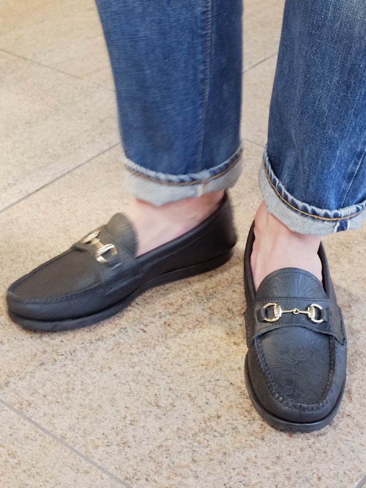 素材感・着心地:フラワーエンボスレザーとビットのアンバランス感が絶妙