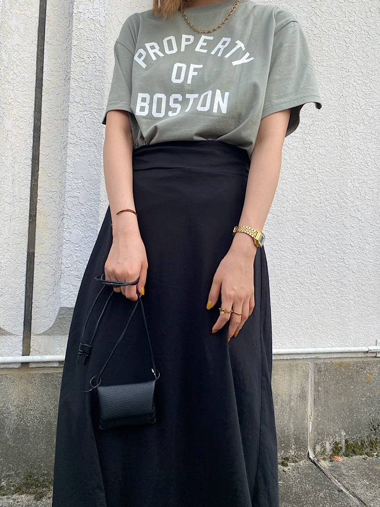カレッジTシャツを主役にした、カジュアルコーディネート。
