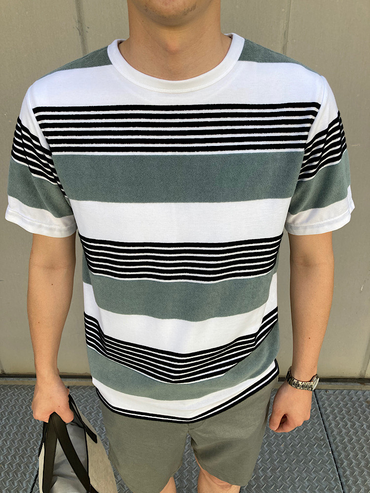 素材感・着心地: 肌触りの優しいパイル生地を使用。ボーダー部分がアクセントになり一枚で様になる。