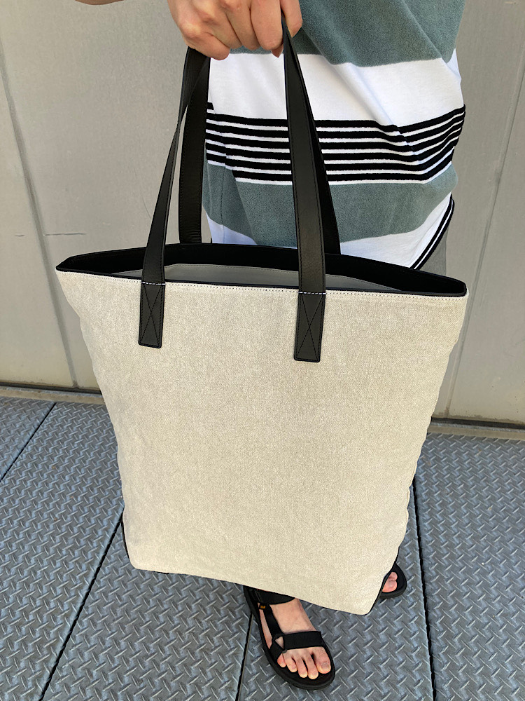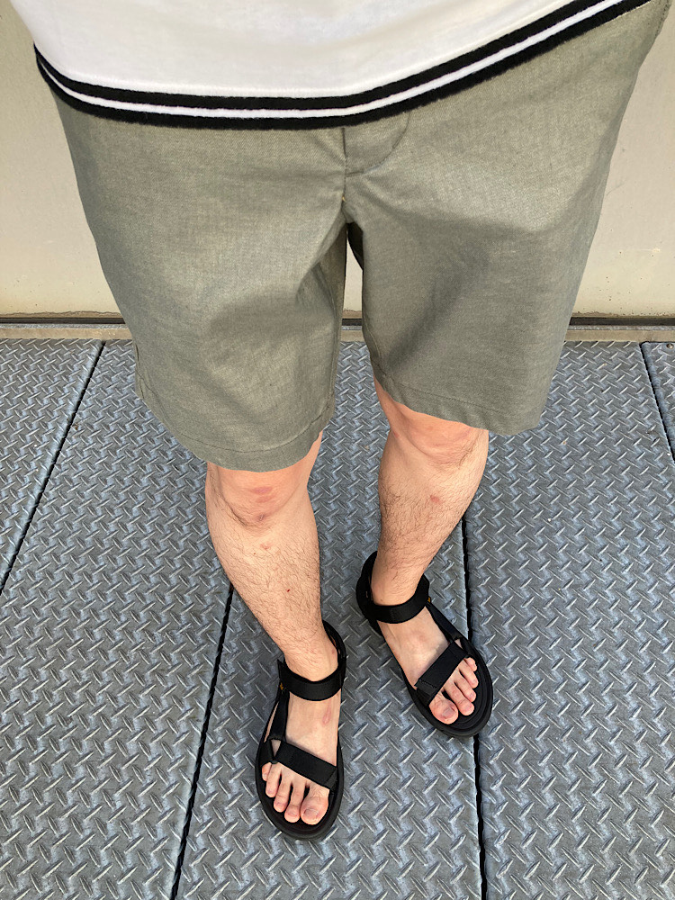 素材感・着心地: リネン80% ポリエステル20%の混合素材。リネンの風合いも残しつつ機能性にも富んでいる為、盛夏での使用でも履きやすい。