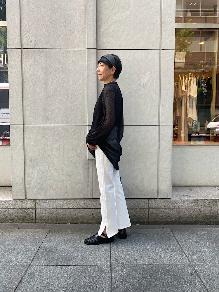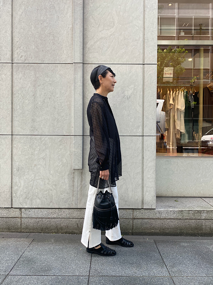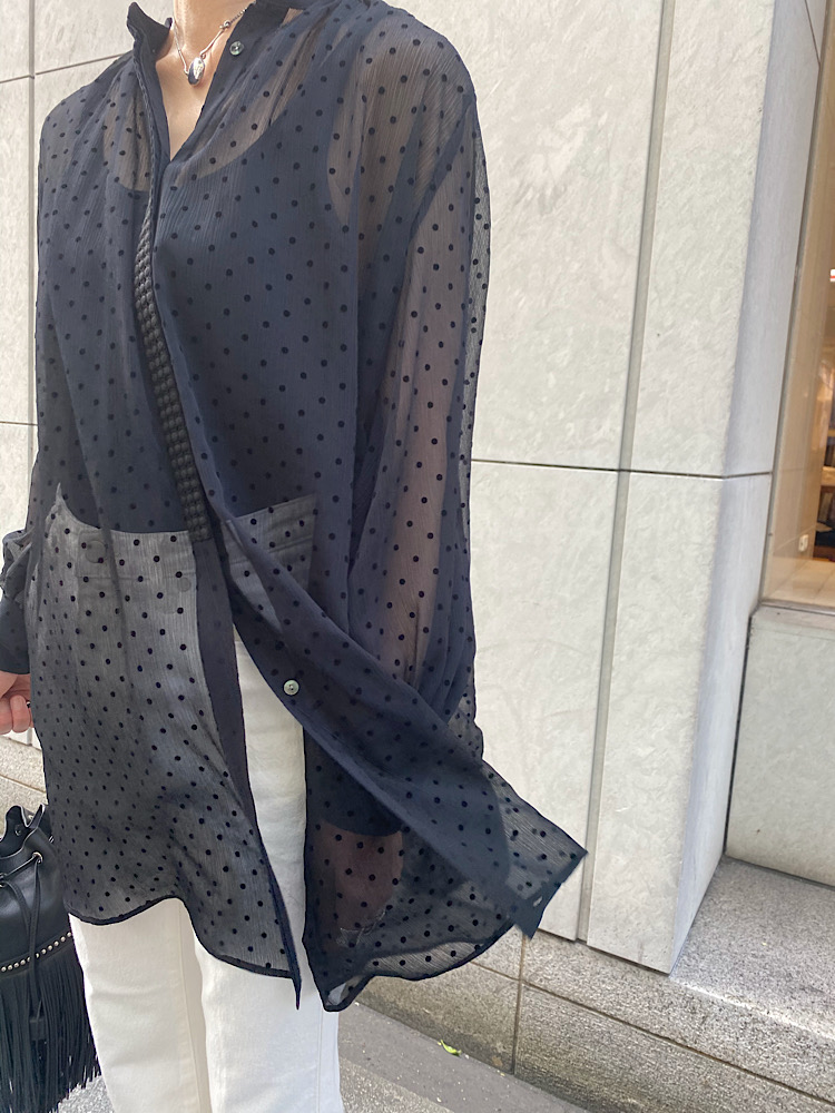 シアーフロッキードットブラウス。動きと共にスイングする軽やかさ。ハードな生地感のボトムとレザーバックを合わせてメリハリあるコーディネートを!