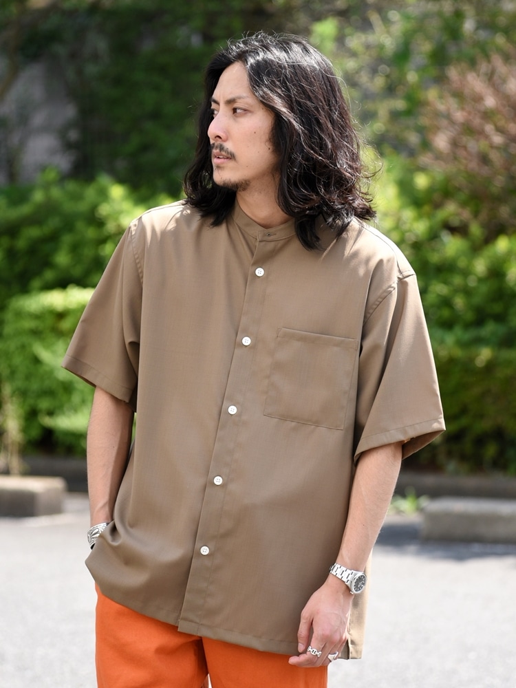高級感のある質感のバンドカラーシャツとリネンパンツを合わせた大人の夏コーデ