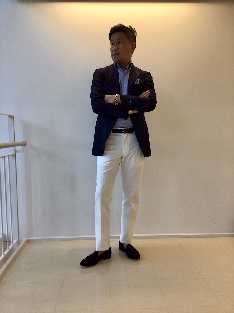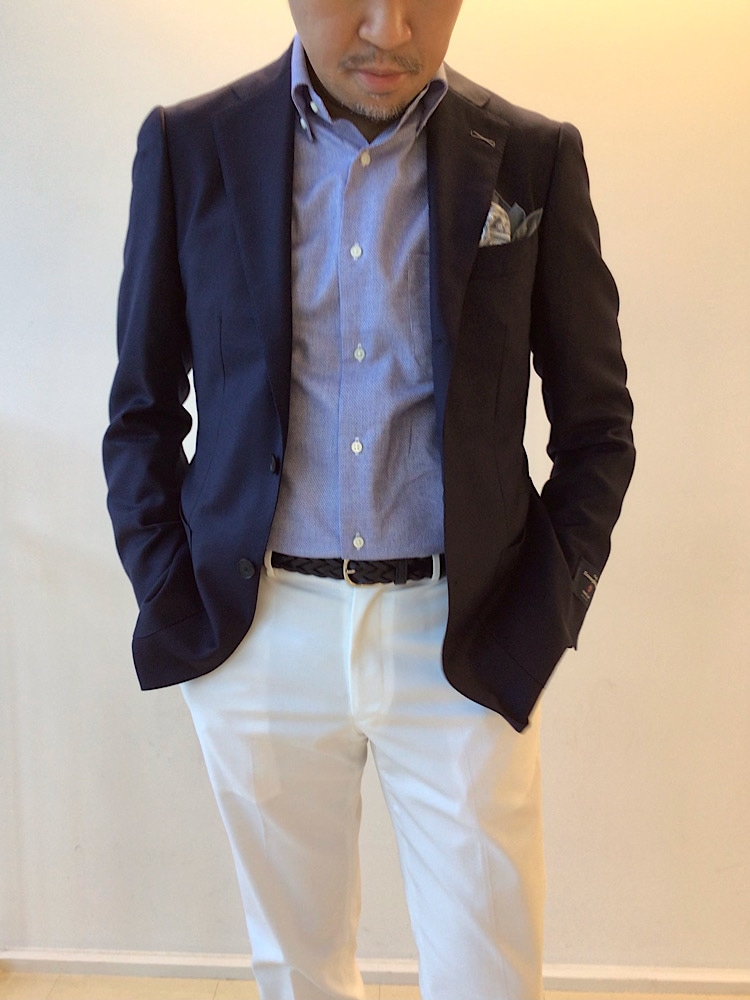 気温が高いので、半袖シャツをスタイリングしました。ジャケットを合わせても決まります。