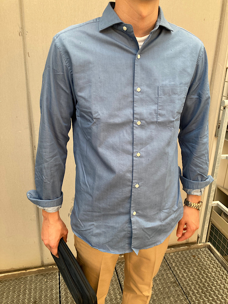 素材感・着心地:デニム調のカラーリングでコットン、キュプラ、ポリエステルの混合生地。その為ストレッチ性もありつつ高級感のある生地感になっている。