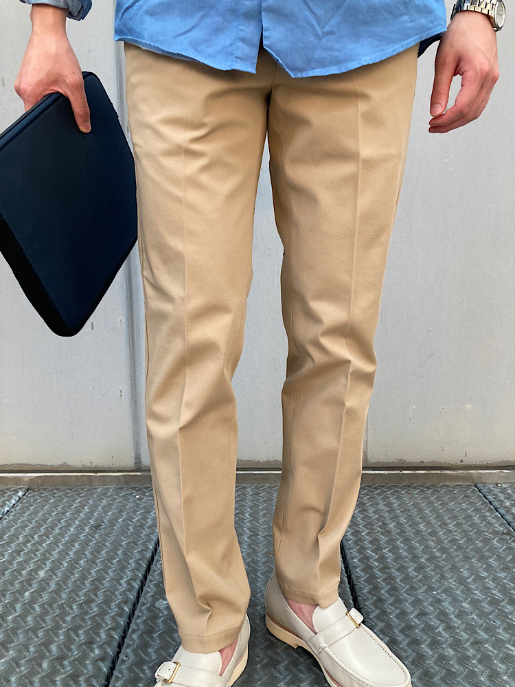 素材感・着心地: 綿とポリエステルの混紡糸を使用しており、光沢感があり上品に見える。また2WAYのストレッチ性が持たせており抜群の履き心地になっている。