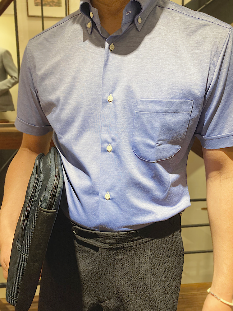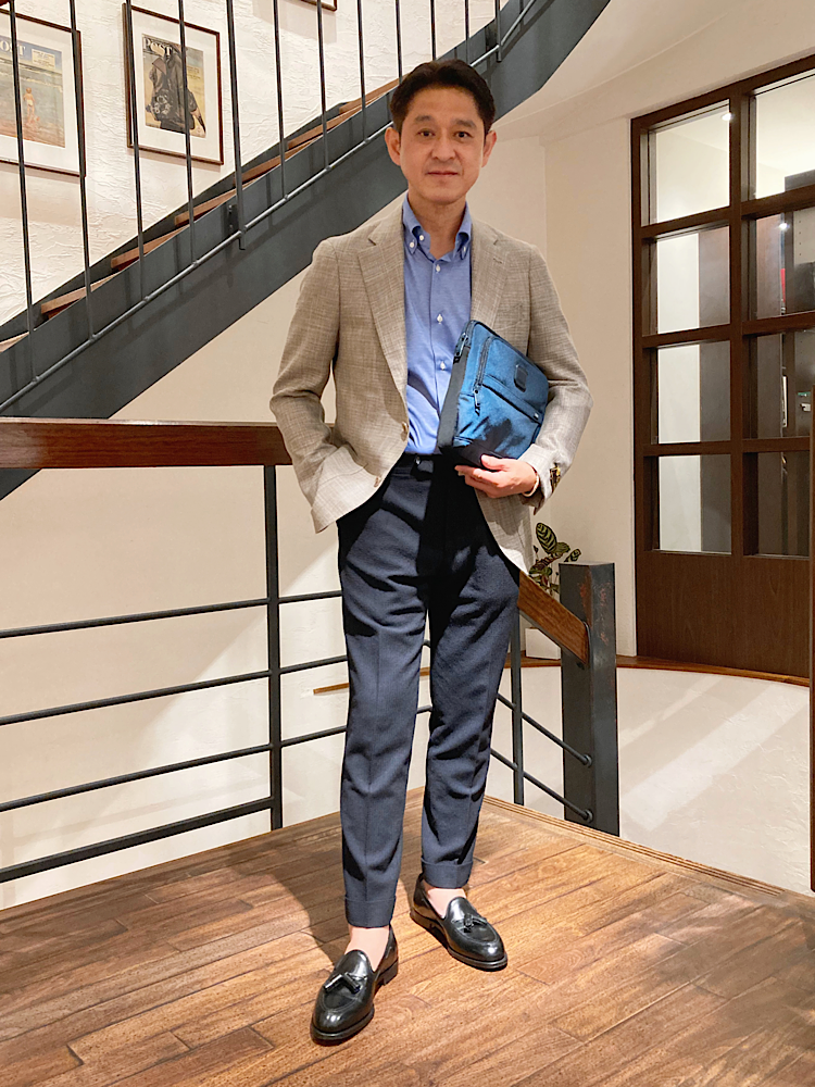 【素材感・着心地:ウールシルクリネンのブレンド生地で、上品な光沢とハリがある。