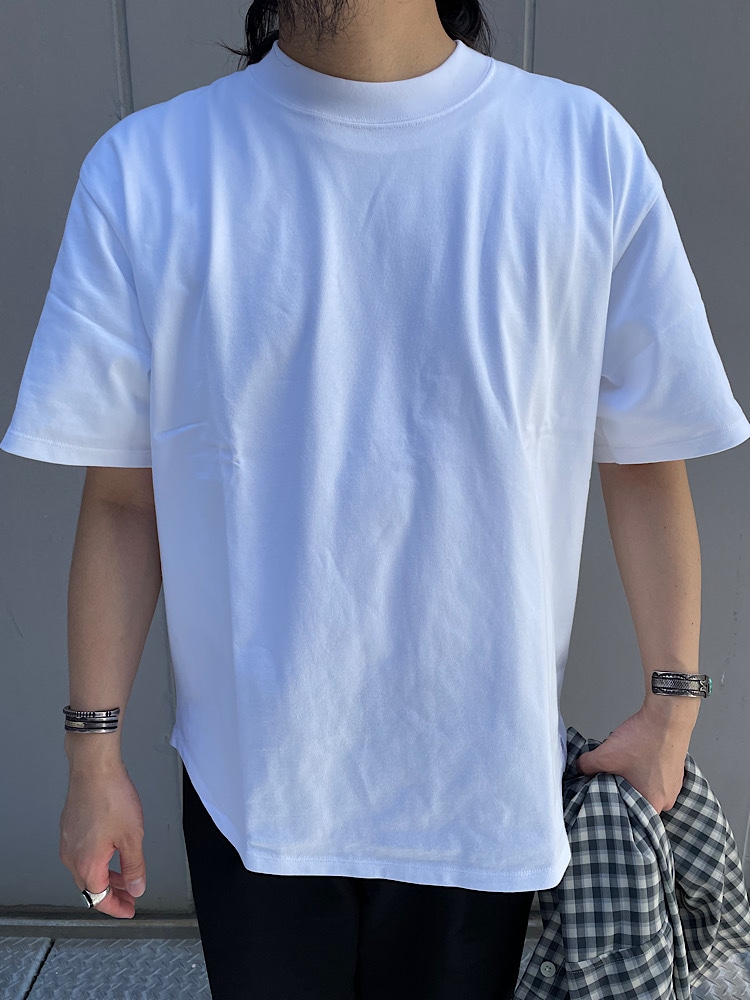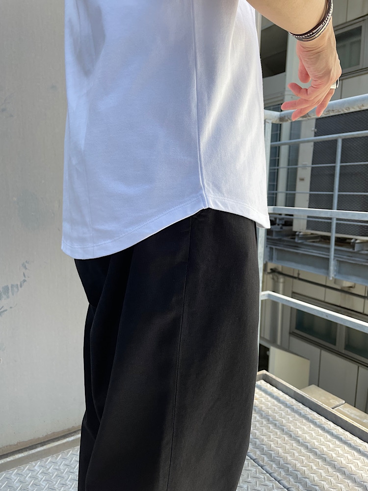 素材感・着心地:光沢のある生地で、肌触りの良い柔らかい素材且つハリのある素材感です。程良いリラックスシルエットで裾が絶妙にラウンドしているのが特徴です。