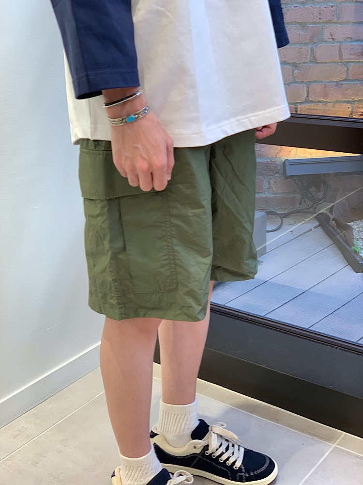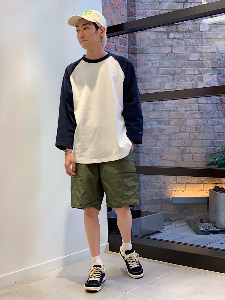 定番のラグランベースボール7分袖Tシャツをカーゴショーツで合わせたシンプルなコーディネートです。