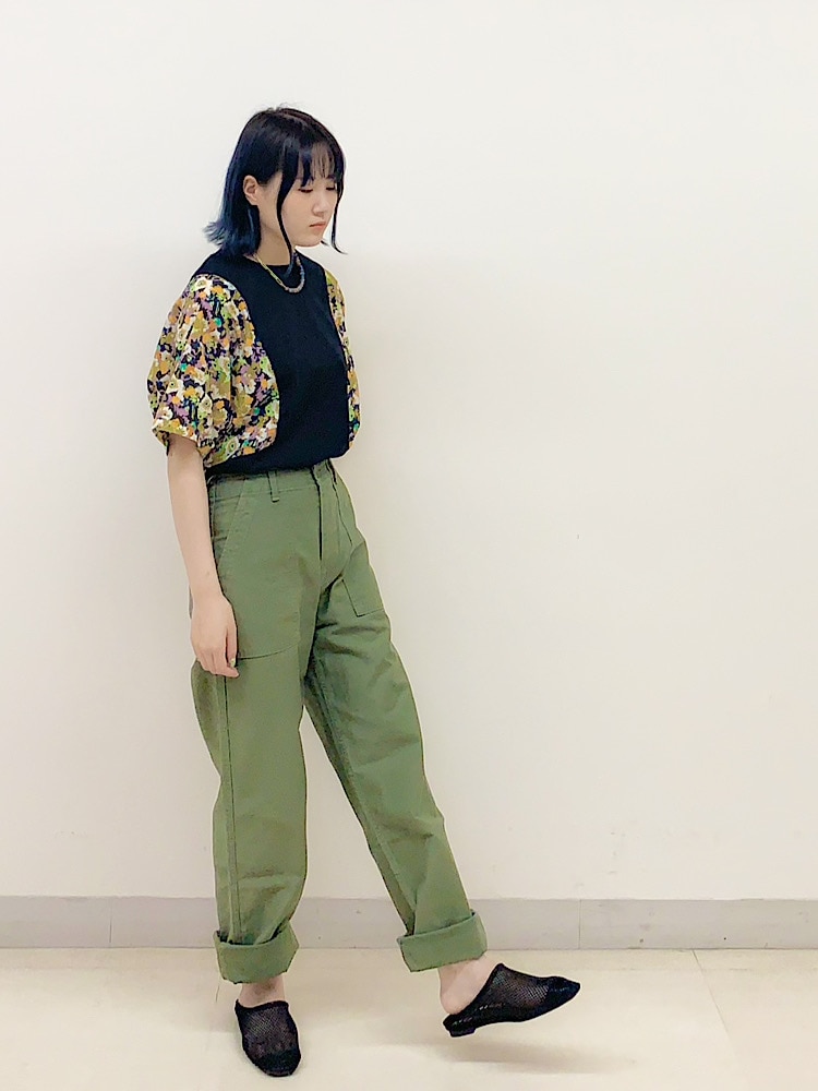 着心地:コットンのしっかりした生地で、透け感無く履きやすい。オールシーズン着られるパンツ。