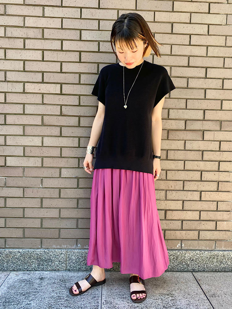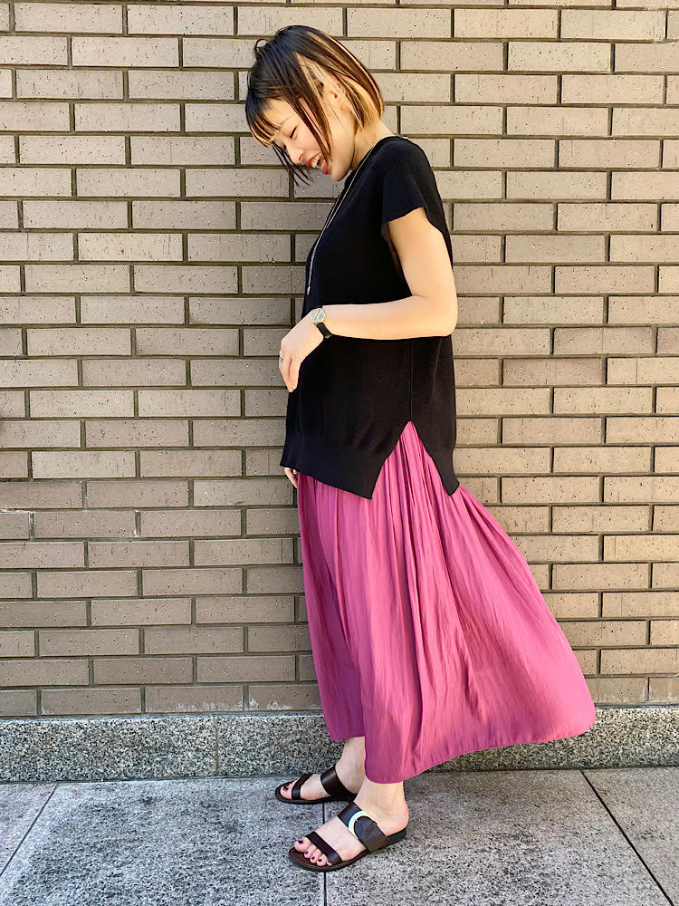 目を引くピンクのシャーリングスカートを主役に