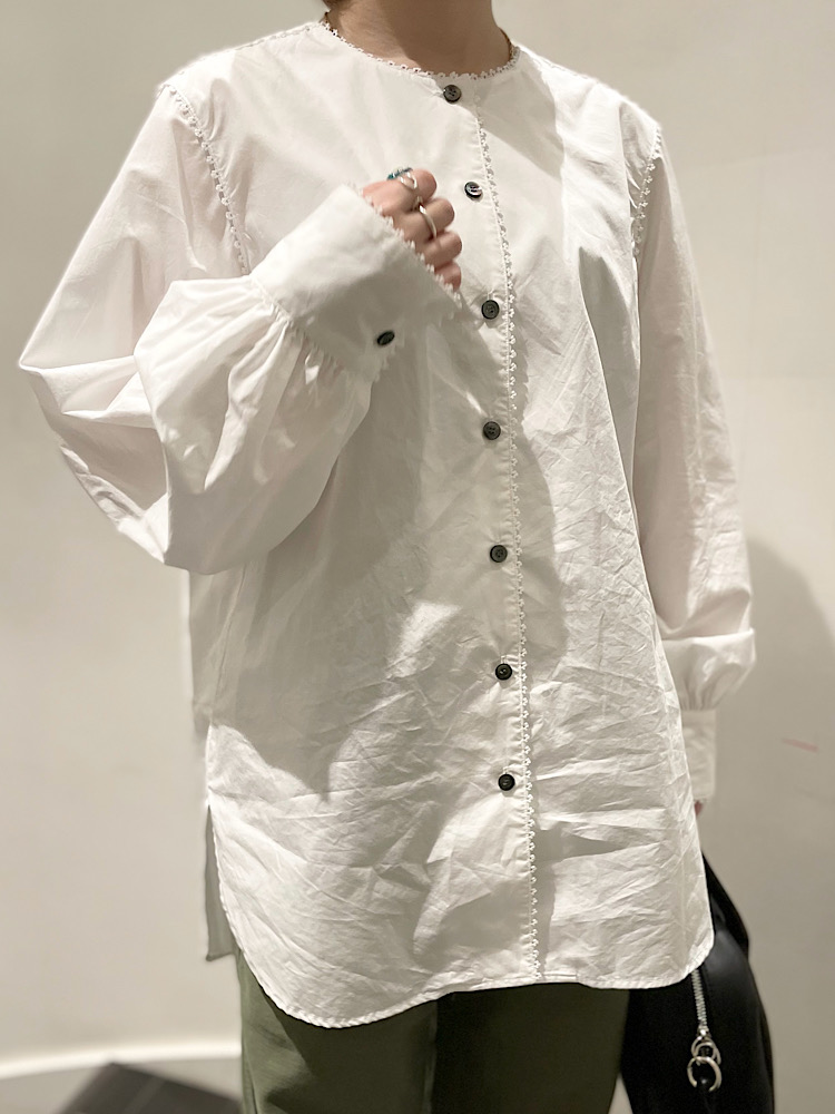 商品紹介:小さなレースが襟、カフス、肩部分に付いているためワンポイントになる1枚です。袖の膨らみも丁度よく、背の小柄な方でも大きく見えずらいと思いました。前のボタンが全部開けれる為羽織としてもお使いいただけます。秋など肌寒い時期には上からスウェットなど着てレイヤードしても可愛いと思います。