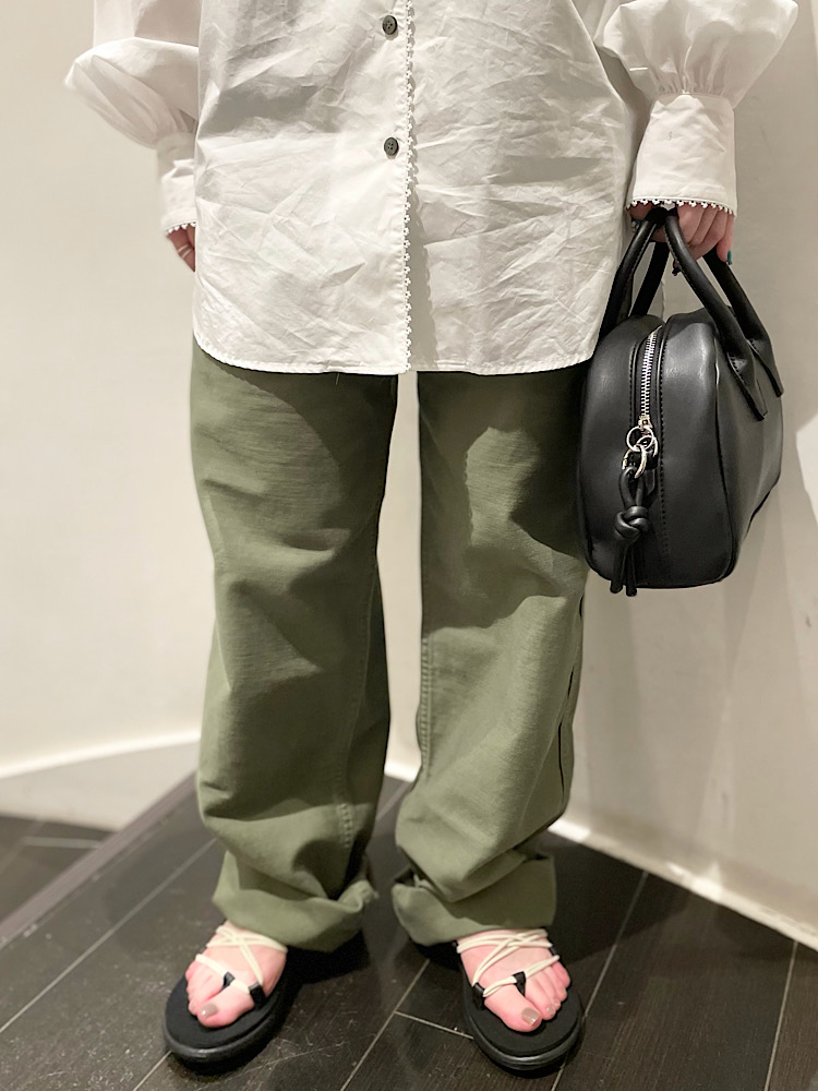 サイズ感:元々サイズが大きめに作られている為ウエストが大きかったですが、ベルトループが付いているのでベルトをして調節してもいいです。丈も長めなので私はロールアップして着てみました。