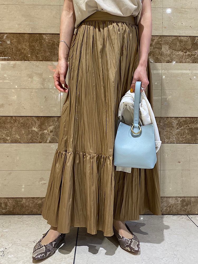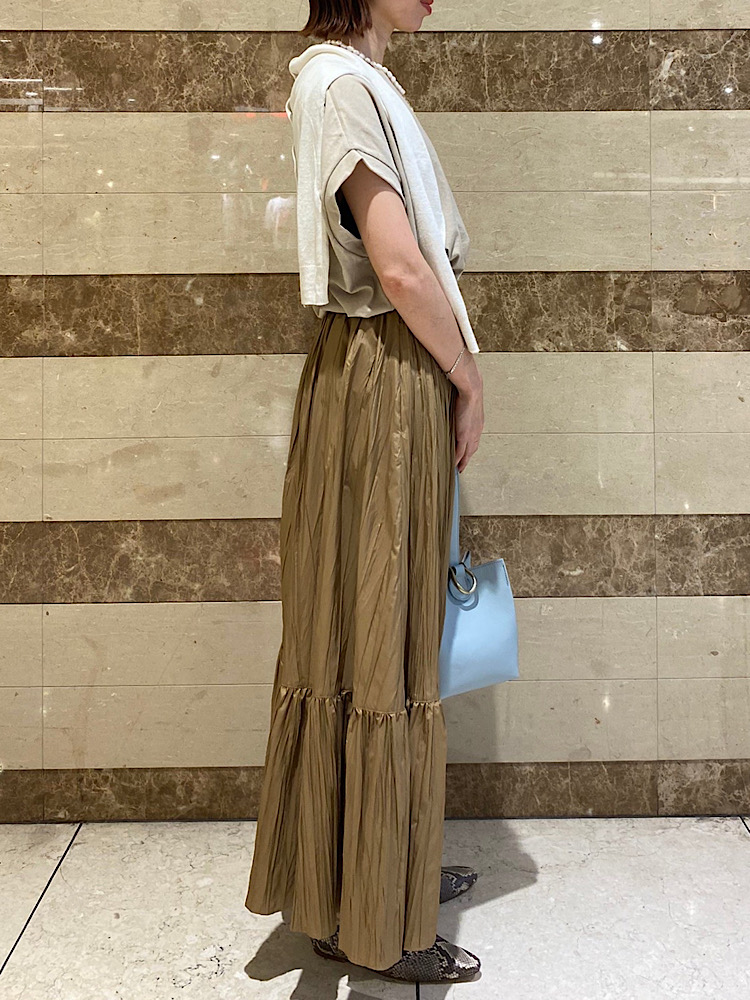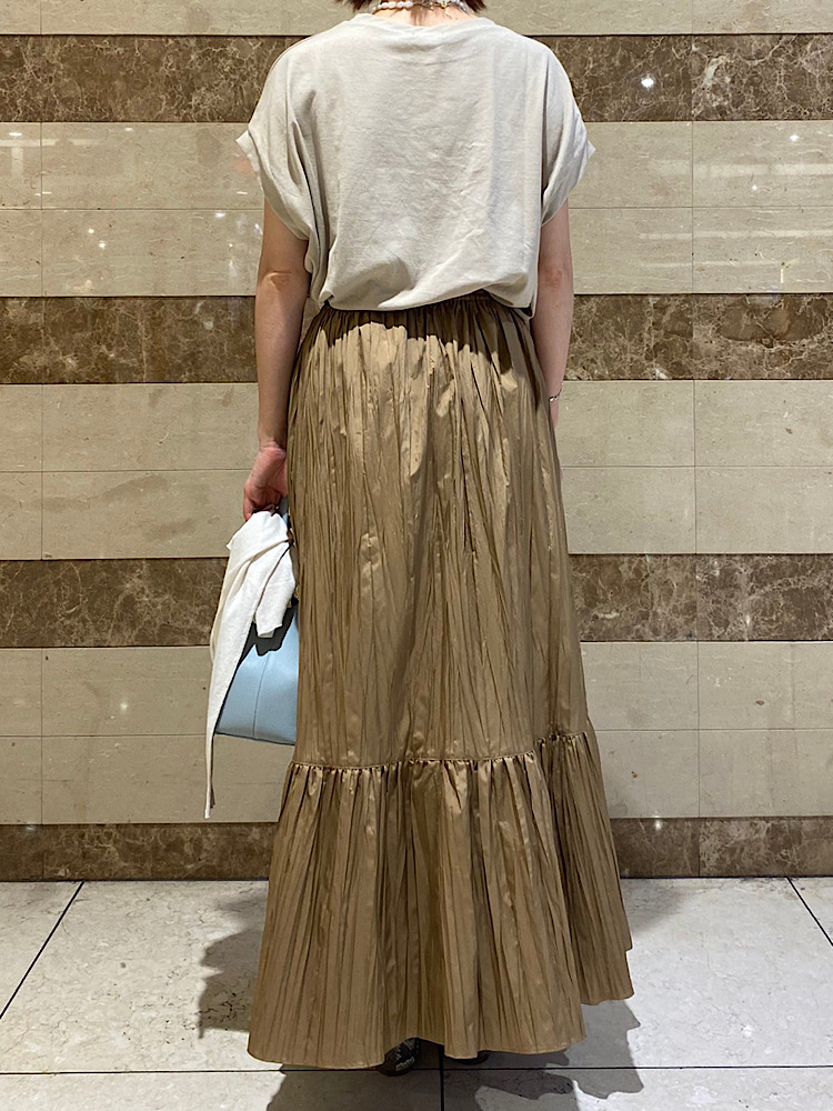 サイズ感:ウエスト周りがギャザーがある割にスッキリ。着丈は足首が見えるくらいで程よいボリュームです。