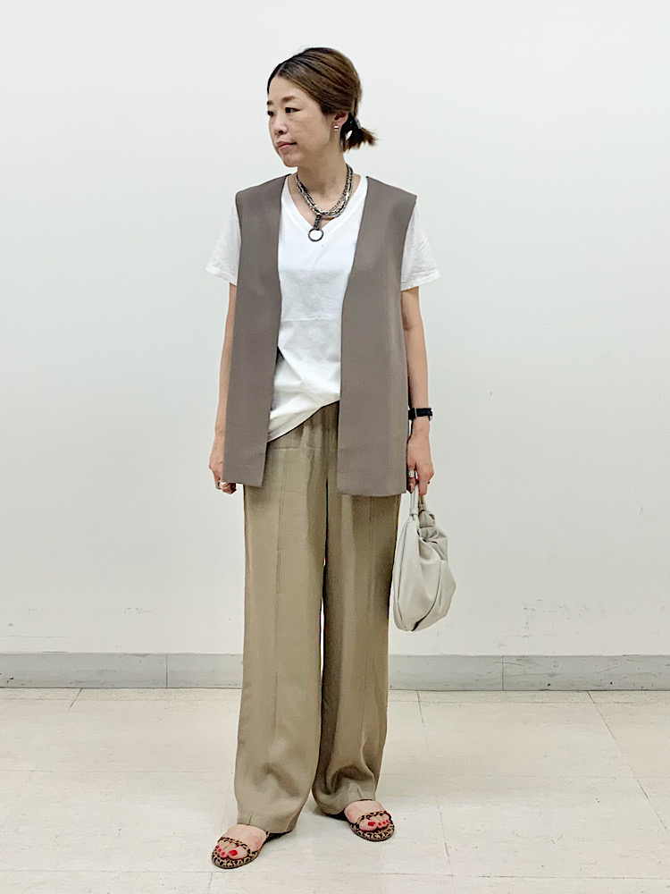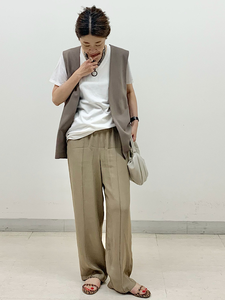【素材感・着心地】かなり軽くさらりとした風合いで、履いていないかのような心地よさ。上品な光沢感があり、ドレッシーな素材に見えるが、イージーパンツ型なので、カジュアルダウンした着こなしも可能。