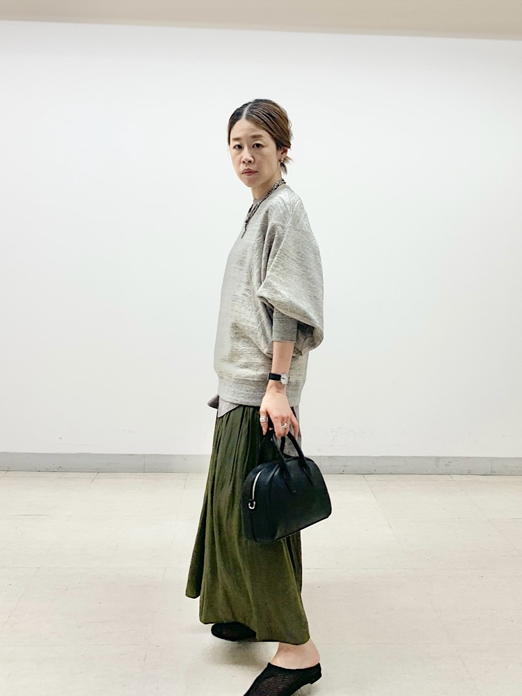 【サイズ感】アームは、かなりゆとりがあり、脇下のボリューム感が可愛い。袖口と裾はリブがあり、締め付ける感じはなく、メリハリが出る。身頃は体が泳ぐゆるさ。