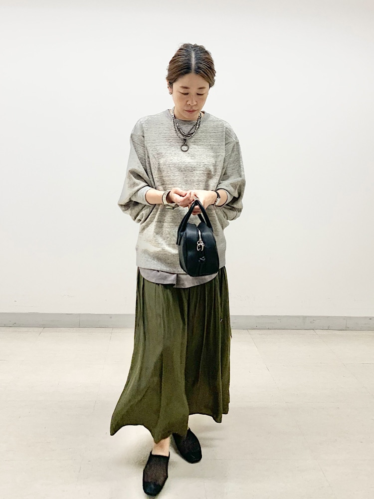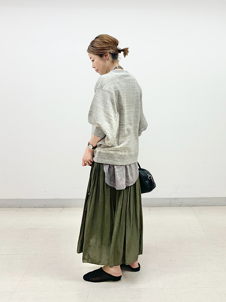【素材感・着心地】裏地付きで薄手でも透けない。ウエストゴムのギャザー仕様だが、膨らみにくく、縦落ちですっきりしたシルエット。リボンはあえて結ばず垂らして甘さ控えめに。