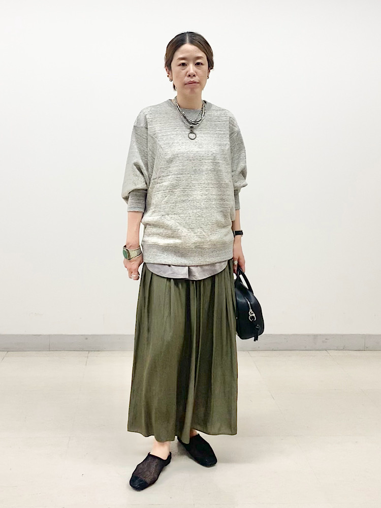 【素材感・着心地】裏起毛なし、通年着られるスウェット。硬さはなく、柔らかい肉感で、ボリュームがあるのにとても着やすい。レイヤードも楽しみやすい軽めの素材。