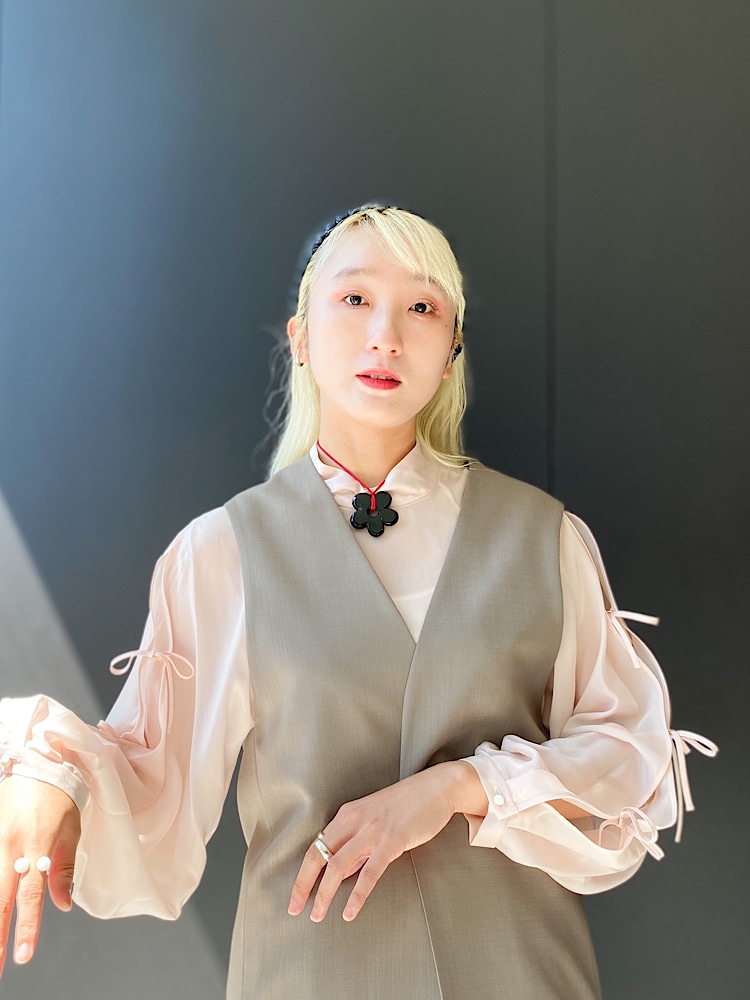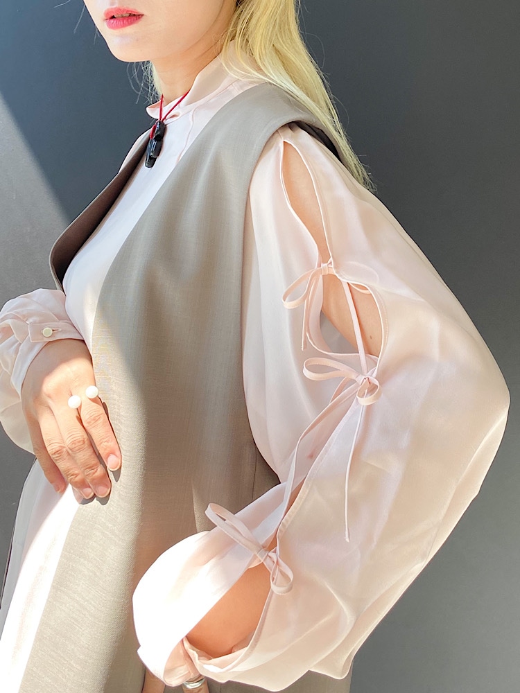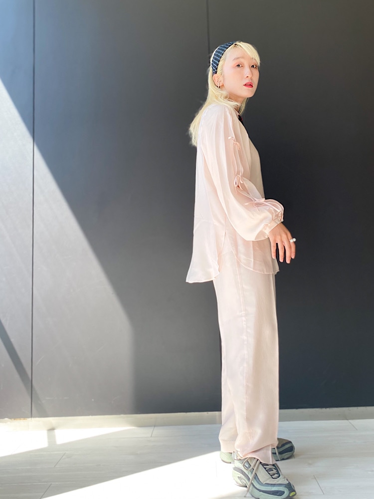 着こなしポイント:少しシアー感がありますので、インナーは暖色がおすすめです