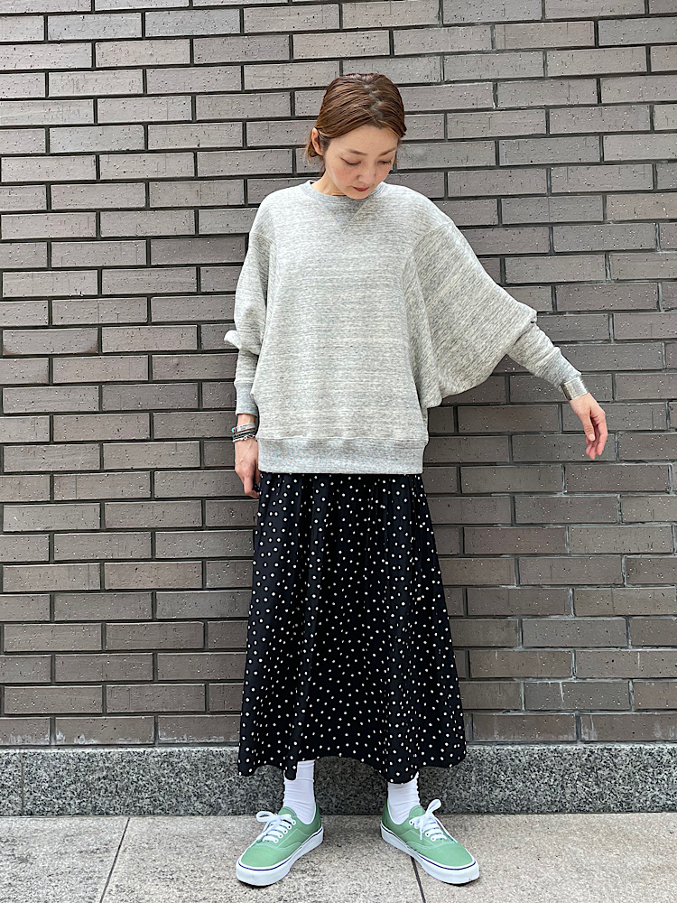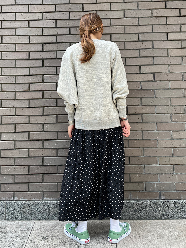 素材感・着心地:スウェットとしては比較的薄手の素材感。肩周りはゆったり、袖にボリュームがあります。中に襟付きのシャツなどを合わせても可愛いです