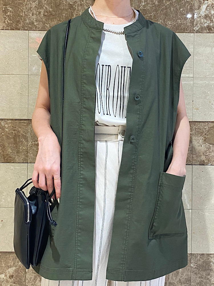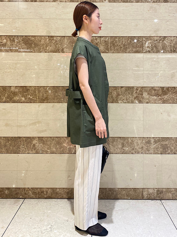 サイズ感:全体的にゆとりはありますが落ち感がある為スッキリ見え。着丈はヒップが隠れ、お袖はフレンチスリーブなので早い時期から着やすいです。