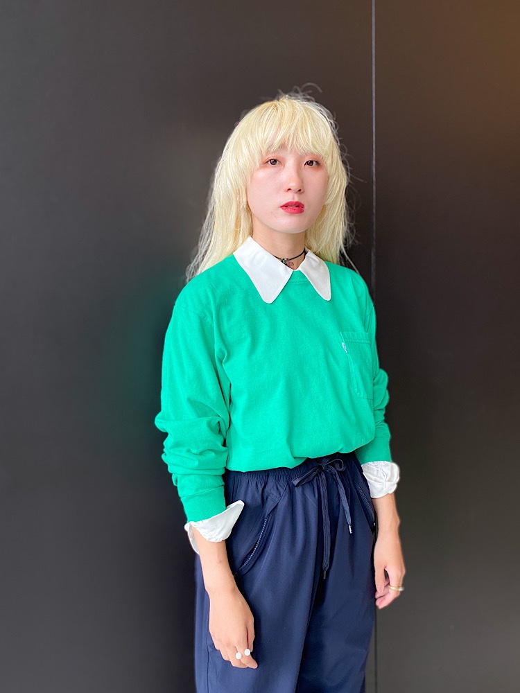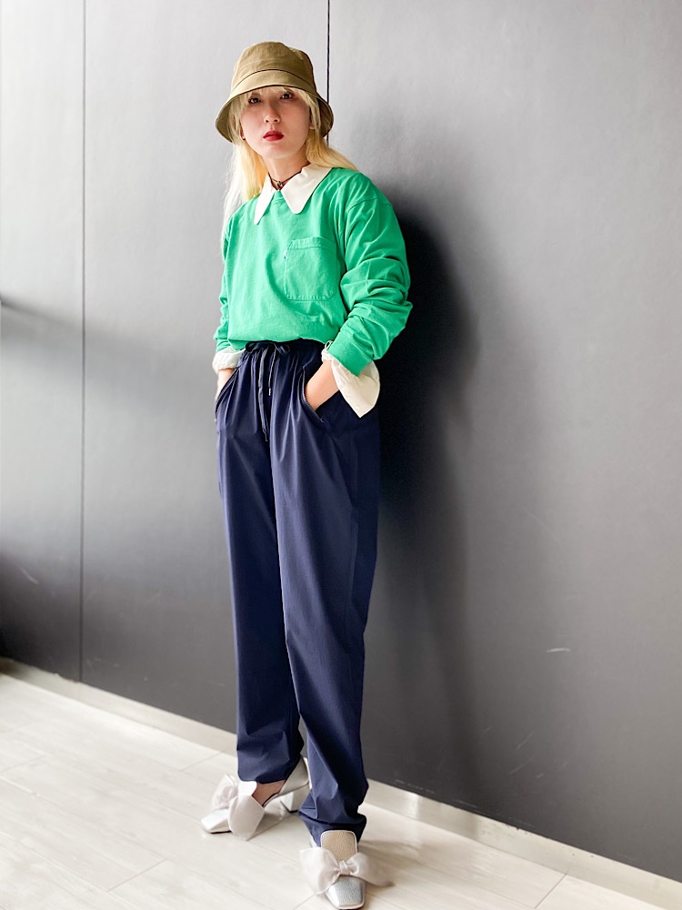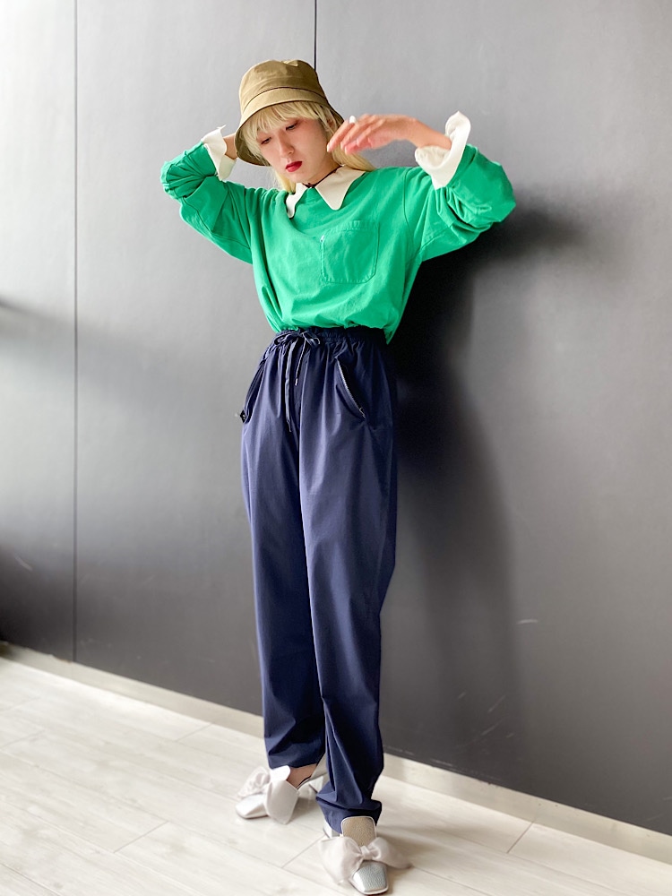 着こなしポイント: 発色の良いグリーンで、ボトムスを落ち着いた色にするとトライしやすいです