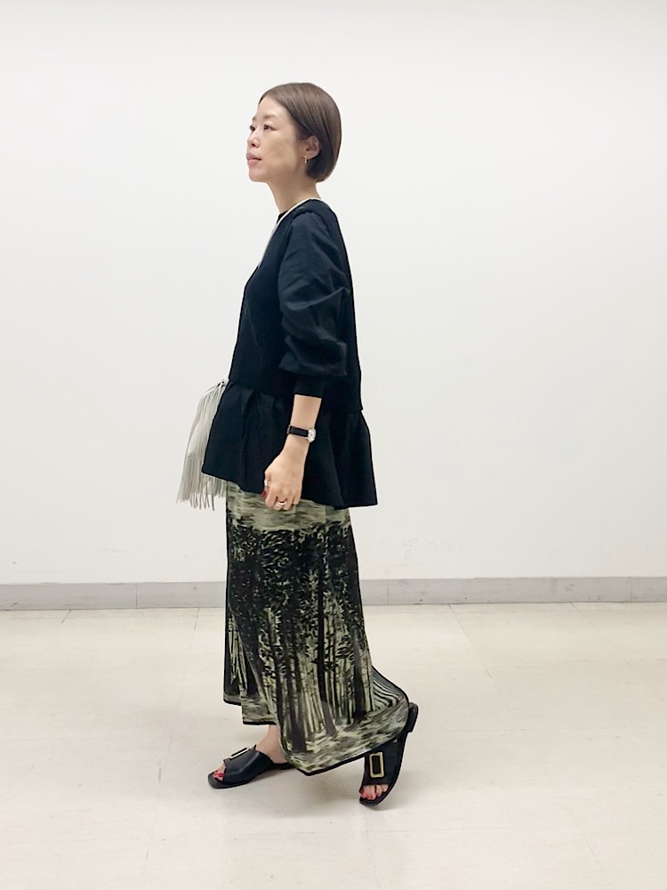 素材感・着心地:かなり薄手の素材だが、プリントがあり、透けないので重ね着なしで着やすい。さらさらした素材で、着丈は長いが軽やか。