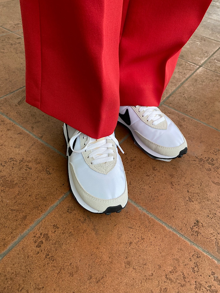 トレンドのカラーパンツをポップにギンガムチェックのブラウスで合わせました。