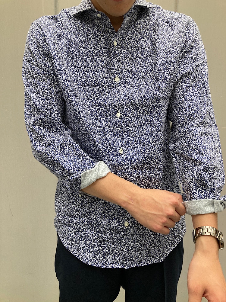 素材感・着心地:ブロード素材に総柄のプリントを施し一見派手に見えるが、ジャケットやブルゾンのインナーとしても使用できアクセントを加えられるアイテム。また柄自体も細かいものなので、浮きにくくパンツを暗めにすれば一枚着での着用も可能。