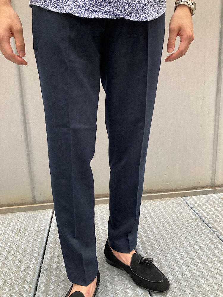 素材感・着心地: ポリエステルとウールの混合生地でストレッチ性に富んでおり、窮屈感は無く履きやすい。スッキリしたシルエットで見た目はほぼウールパンツなので、ビジネスシーンでの着用も可能。同生地のジャケットもありSETUPでの着用が可能。