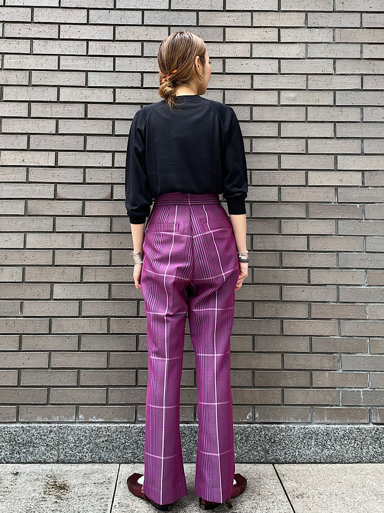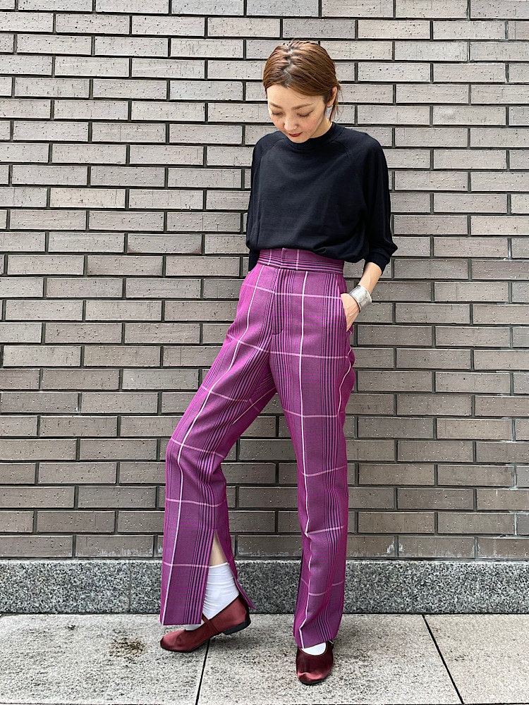 素材感・着心地:ハリのある素材で、しっかりとした生地感です。ハイウエストで裾がフレアになっており、脚長効果抜群です