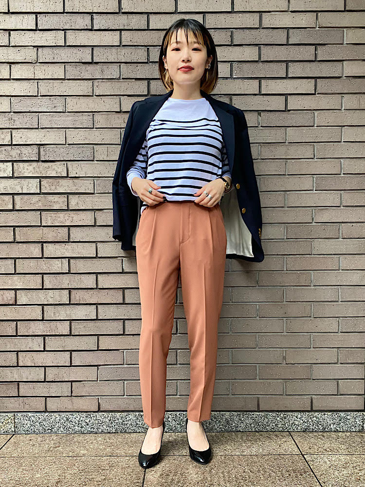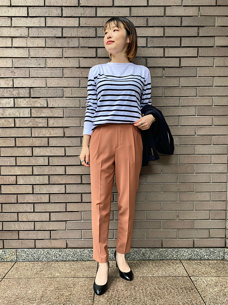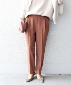 ピンクのテーパードパンツと合わせきれいめな印象に