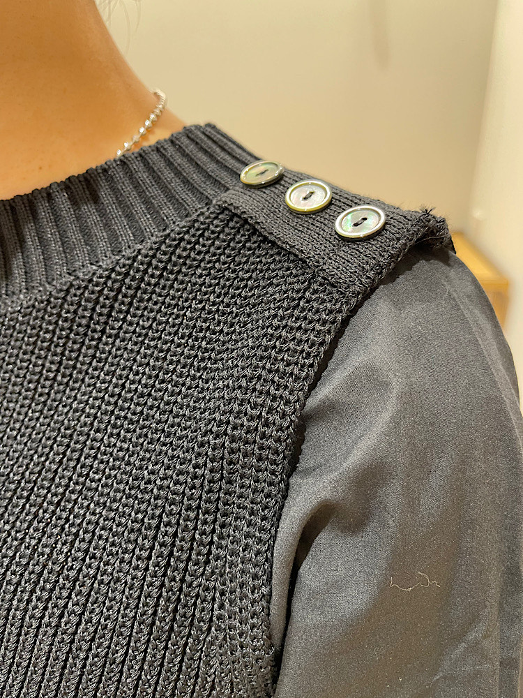 素材感・着心地:ニット部分はコットン混紡で、チクチク感なく着ていただけます。