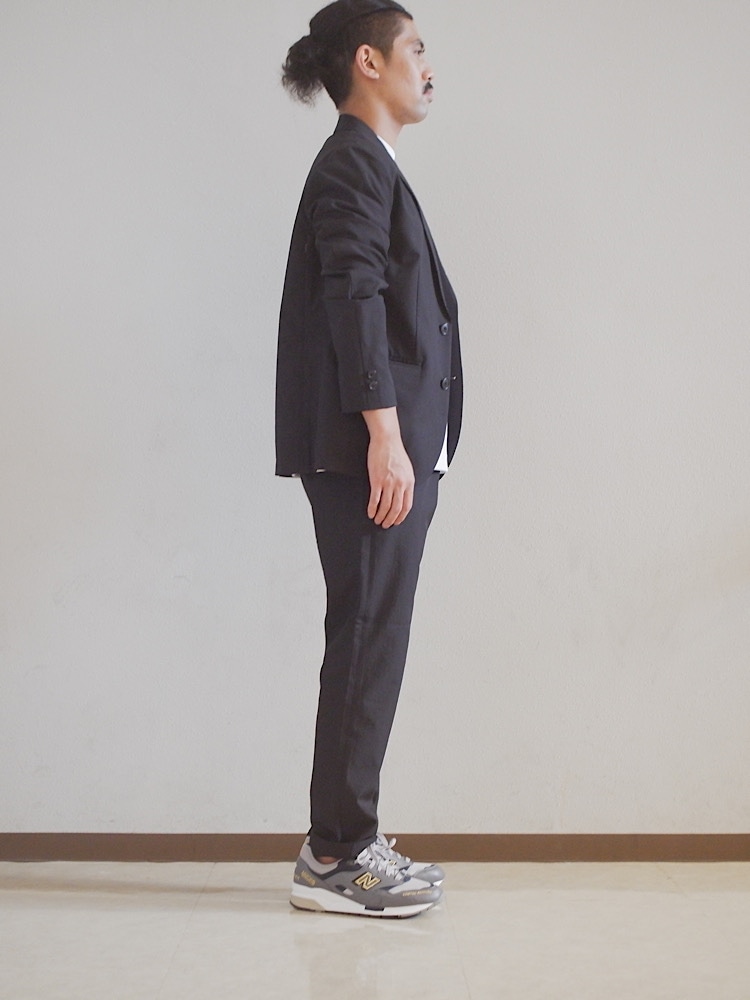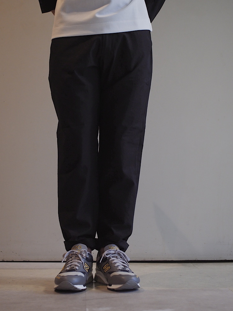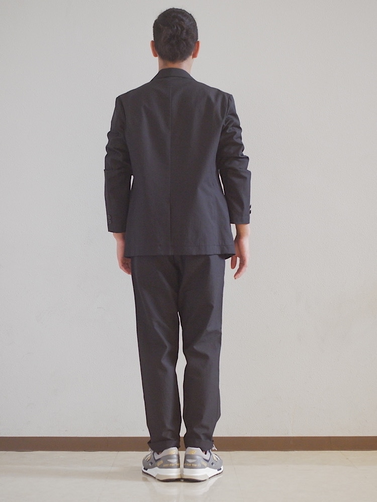 腰回りゴムあり。組みのジャケットに比べると、少し細めだはあるが、リラックスしたサイズ感。