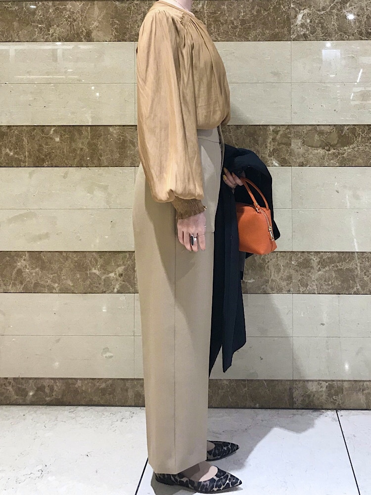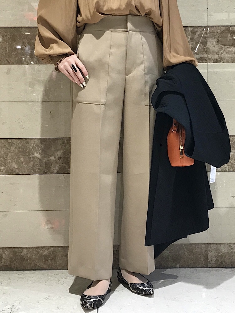 素材感・着心地:ポリエステルにレーヨン混ですがウール見えする厚みと素材。マットな素材感でサラッとしてる為今からでも穿いて頂けます。