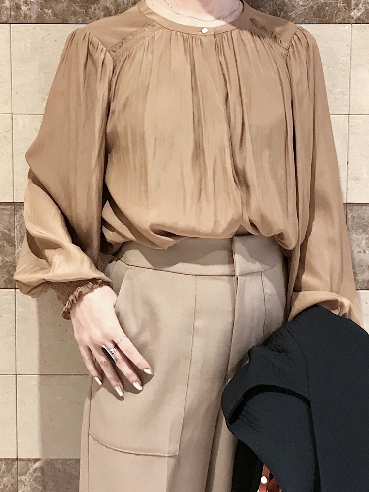 サイズ感:全体的にゆとりがあり、窮屈さ無く着やすいです。袖にボリュームがありますが生地に落ち感がある為控えめなシルエットに。