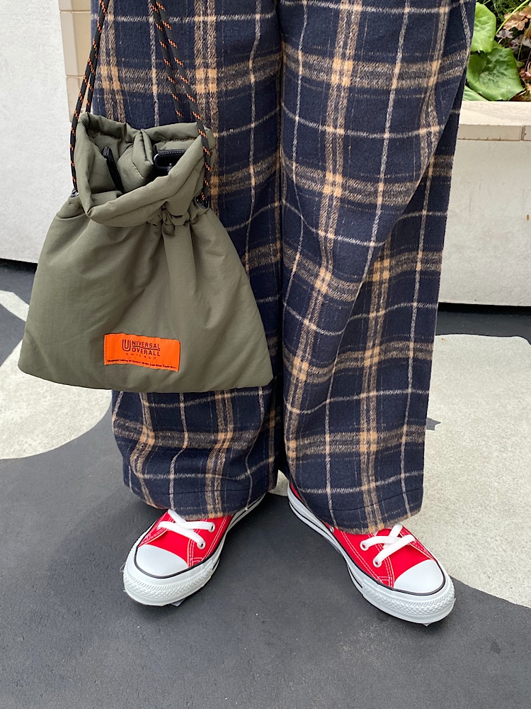 赤をポイントカラーとしてトップスとスニーカーで合わせました。