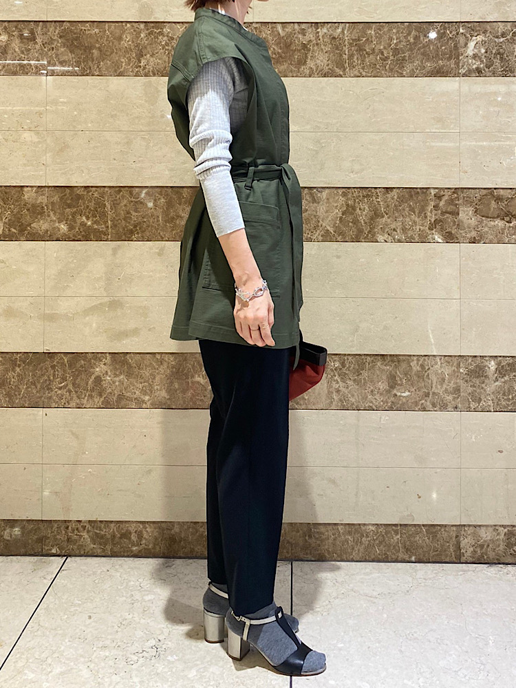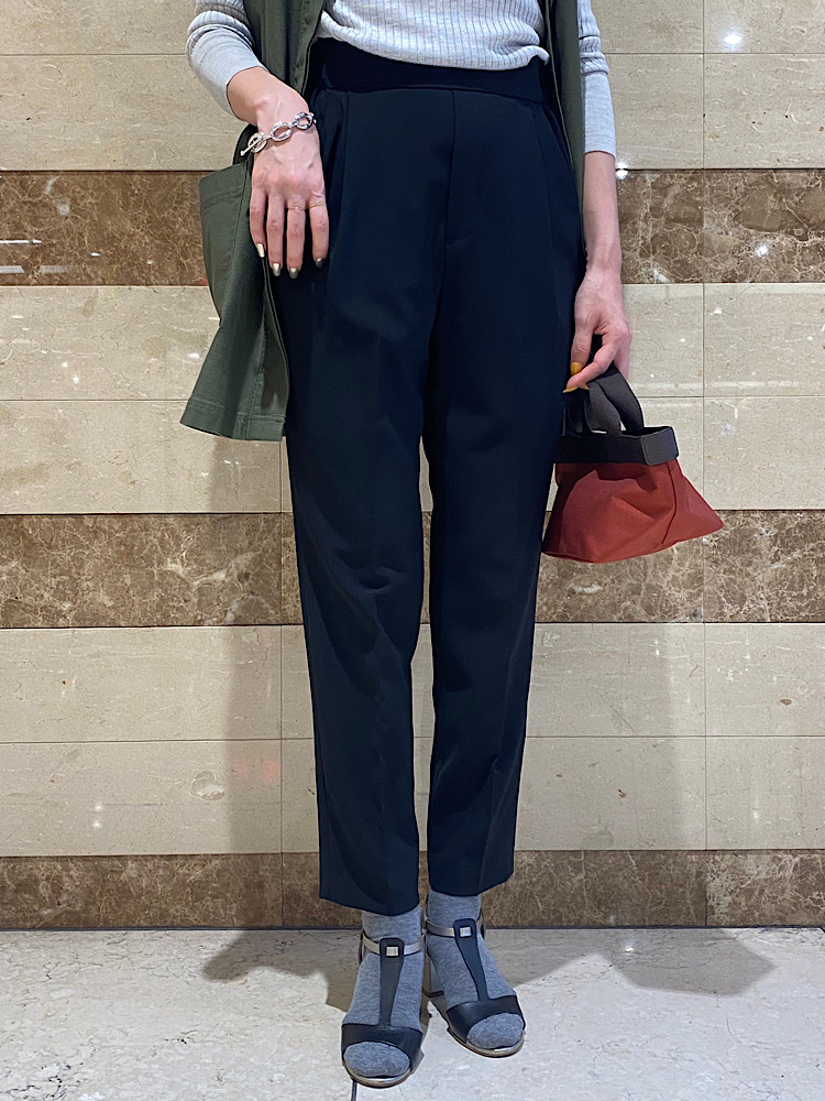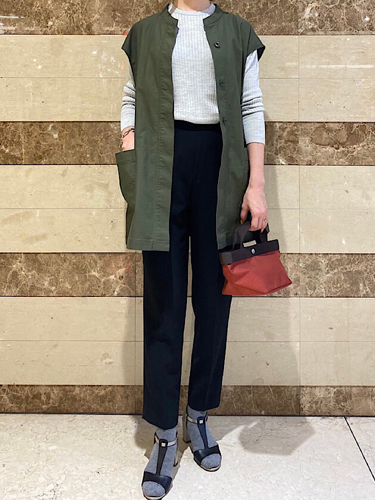 素材感・着心地:ハリのある素材ですが伸縮性がある為ごわつかずに落ち感があります。生地は厚過ぎないので暑くなく、重ね着を楽しめます。