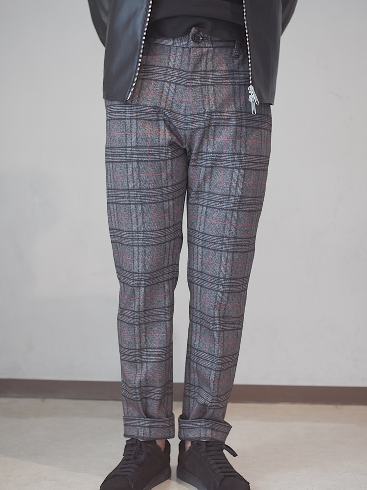 ポリエステル×レーヨン素材。生地の感じウールに見えるので、冬にも着こなせる幅広いパンツ。ポンチパンツになるので柔らかく生地のタッチも良い。