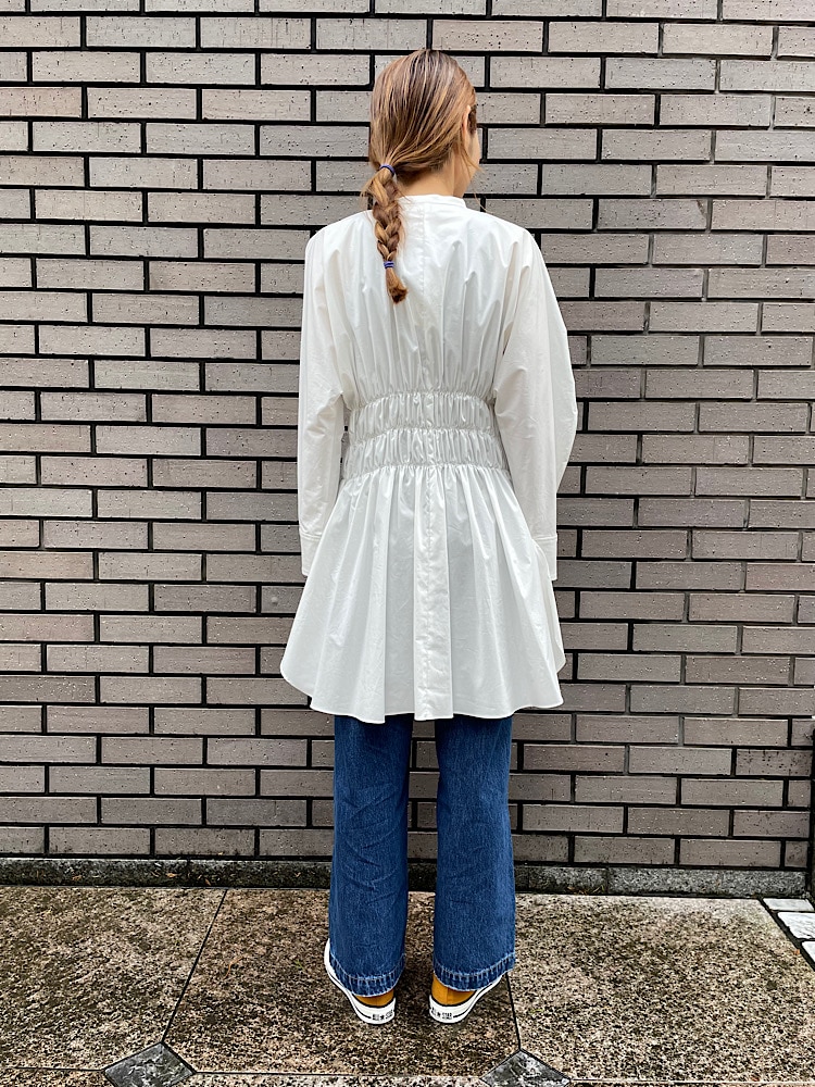 素材感・着心地:コットンでやや光沢があります。肩周り、袖にはボリュームがありますが、身頃のステッチ部分に細いゴムが通っており、体にフィットするシルエットです